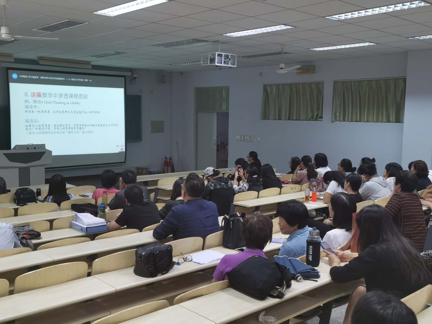 为深入学习课程思政在外语教学中如何应用,如何开展,如何与教学内容衔接。9月23日,公司全体教师在C-105多媒体教室集中线上学习,同时听取梁文霞教授的《课程思政与综合英语课程教学》的讲座,讲座深入浅出,切实解决了老师们关注的问题,受益匪浅。
