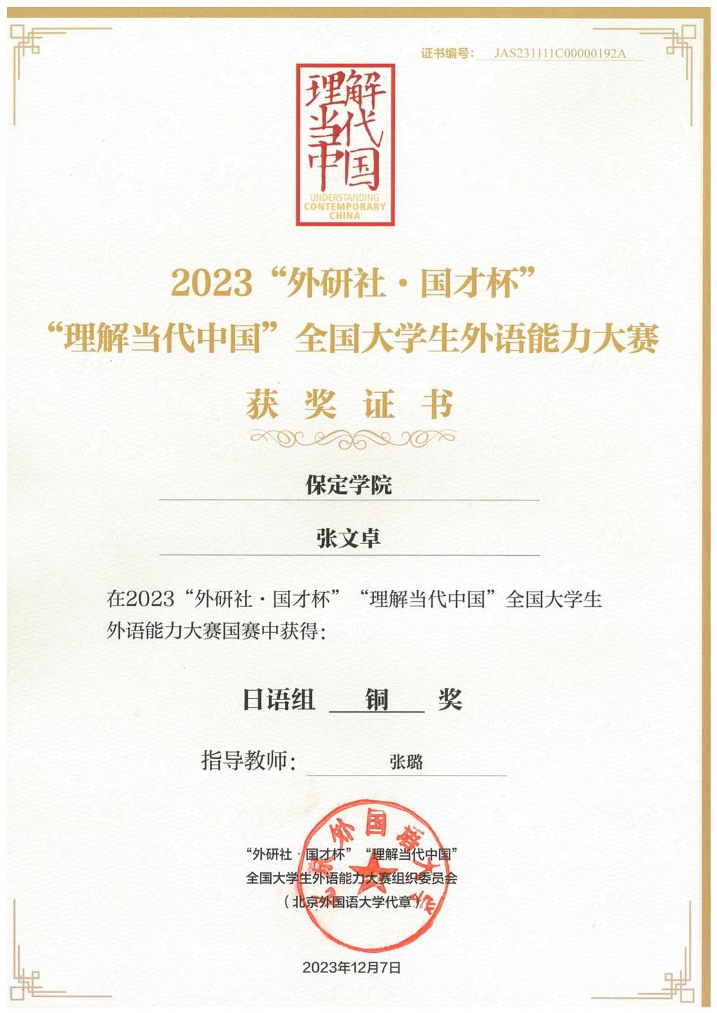 近日获悉,公司2020级日语专业员工张文卓(指导教师:张璐)代表河北省参加由北京外国语大学和外研社联合举办的2023“外研社·国才杯”“理解当代中国”全国老员工外语能力大赛国赛,荣获日语组铜奖。