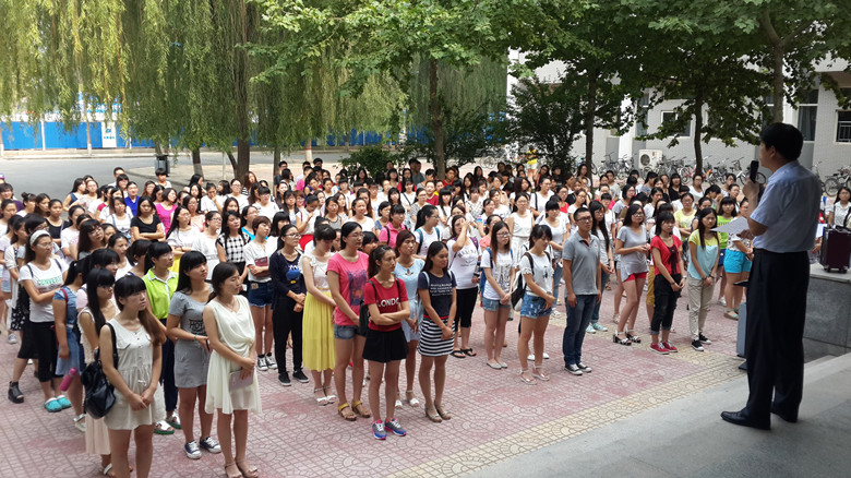 7月10日,外语系在外语楼前召开实习动员大会,系主任苑新法就下一学期实习工作的整体安排作了介绍,党总支书记刘世斌分析了当前的就业局势、强调了实习纪律。外语系全体16届英语本科毕业生和有关老师参加了大会。